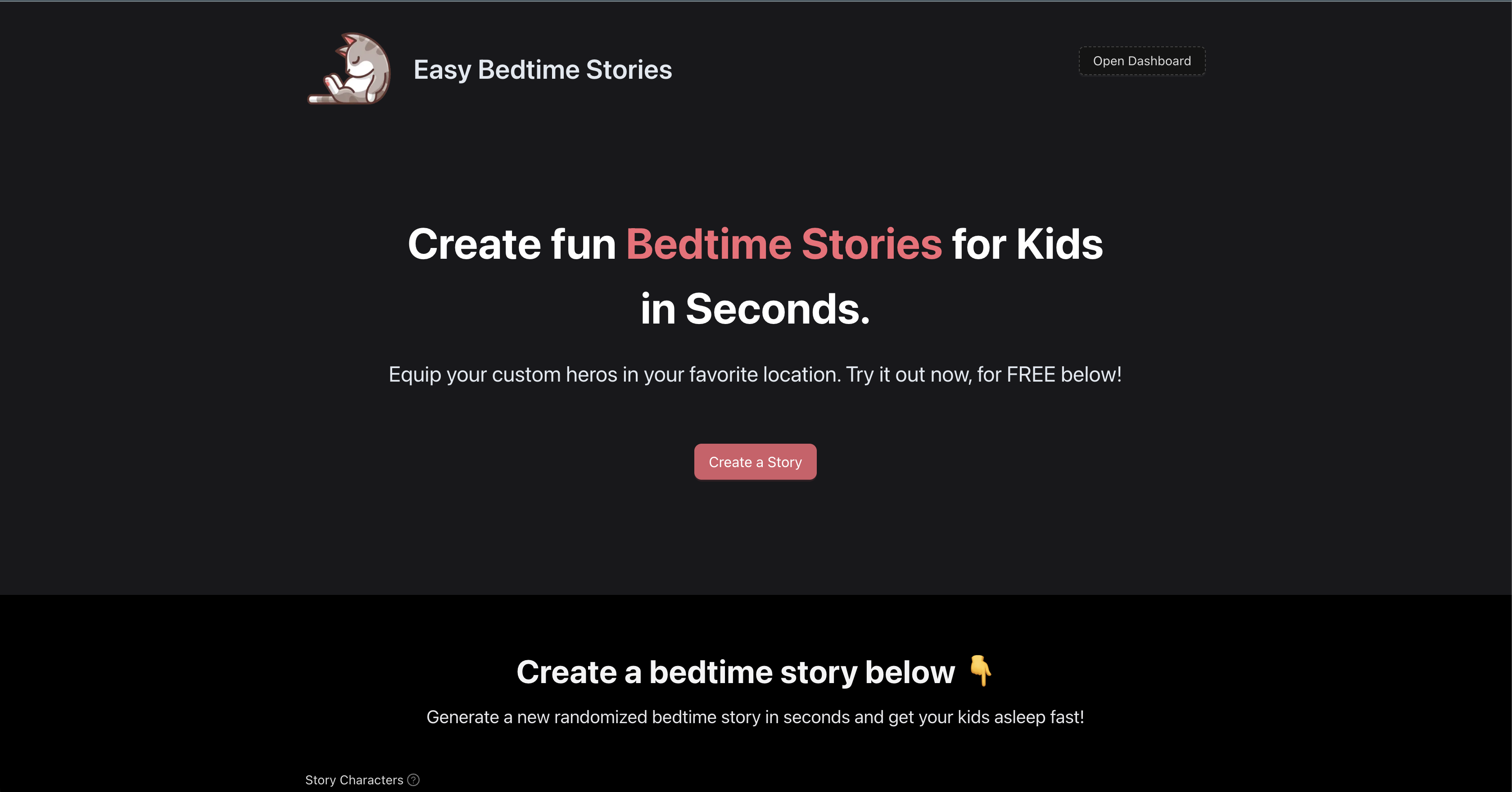 A quick hack with a good friend. Easy Bedtime Stories uses AI to build a customised bed time story to put your young ones to sleep fast. Frank Adler helped drive the idea and we wanted to jump on the OpenAI train to see how quickly we could build an AI business in this vertical.